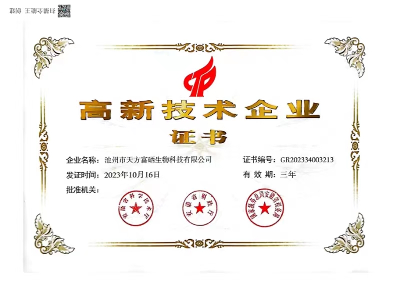 近日,池州市天方富硒生物科技有限公司正式通過高新技術(shù)企業(yè)認定,榮獲由安徽省科學(xué)技術(shù)廳、安徽省財政廳、國家稅務(wù)總局、安徽...